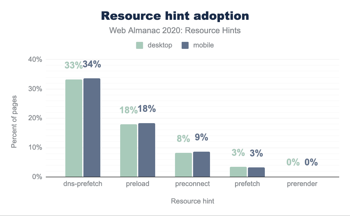 dns-prefetch resource hint, 18% use preload, 8% use preconnect, 3% use prefetch, and less than 1% use prerender. Mobile is similar, except that dns-prefetch has 34% usage (1% higher), and preconnect has 9% (1% higher).The relative popularity of dns-prefetch with 33% adoption compared with other resource hints is unsurprising as it first appeared in 2009, and has the widest support out of all major resource hints.
