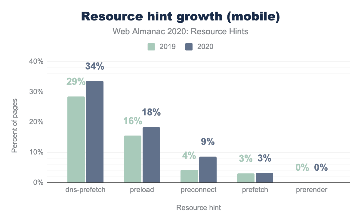 dns-prefetch increased 5%, from 29% to 34%. preload increased 2%, from 16% to 18%. preconnect increased 5%, from 4% to 9%. prefetch remained flat at 3% usage. prerender also remained flat at less than 1% usage.preload usage has had a slower growth with only a 2% increase from 2019. This could be in part because it requires a bit more specification. While you only need the domain to use dns-prefetch and preconnect, you must specify the resource to use preload. While dns-prefetch and preconnect are reasonably low risk, though still can be abused, preload has a much greater potential to actually damage performance if used incorrectly.
