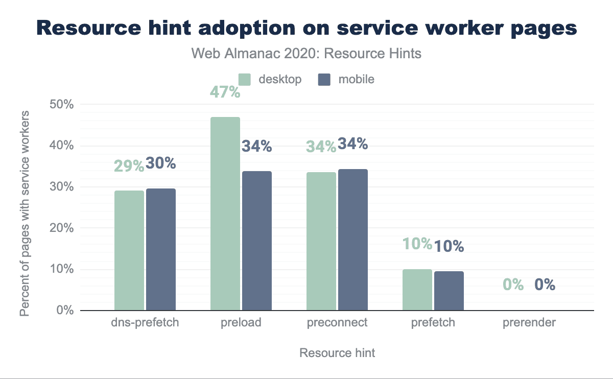 dns-prefetch resource hint, 47% use preload, 34% use preconnect, 10% use prefetch, and less than 1% use prerender. Mobile is similar, except that dns-prefetch has 30% usage (1% higher), and preconnect has 34% (13% lower).For preload on desktop we have an outstanding 47% rate of adoption and prefetch a 10% rate of adoption. In both cases the data is much higher compared to average adoption without a Service Worker.