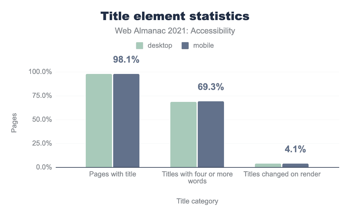 <title> element, 68.5% and 69.3% of those titles have four or more words, and 4.1% on both desktop and mobile are changed on render.Our data shows 98% of web pages have a title. However, only 68% of those pages have a title containing four or more words, meaning that it is likely that a significant percentage of web pages do not have a unique, meaningful title that provides enough information about the content of the page.