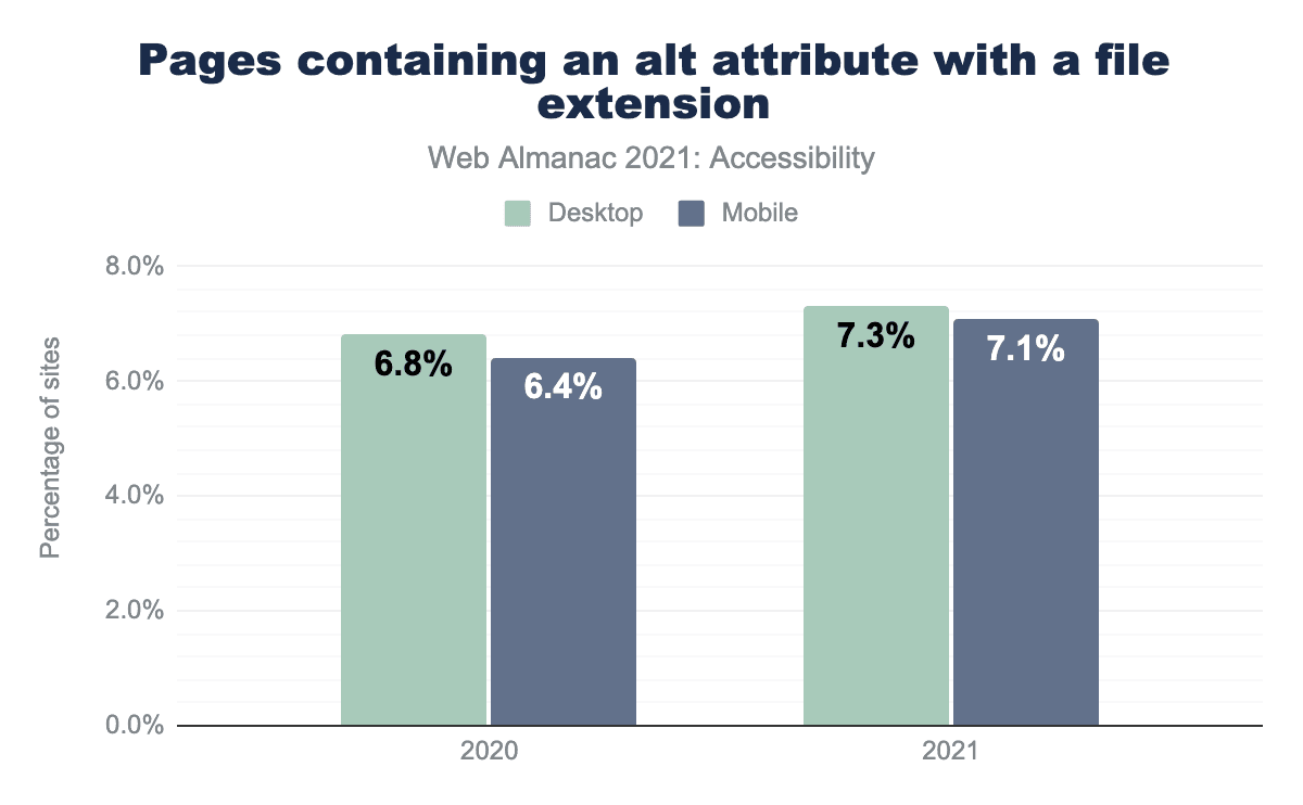 alt attribute. This increased to 7.3% of desktop sites and 7.1% of mobile sites in 2021.alt attribute with a file extension.