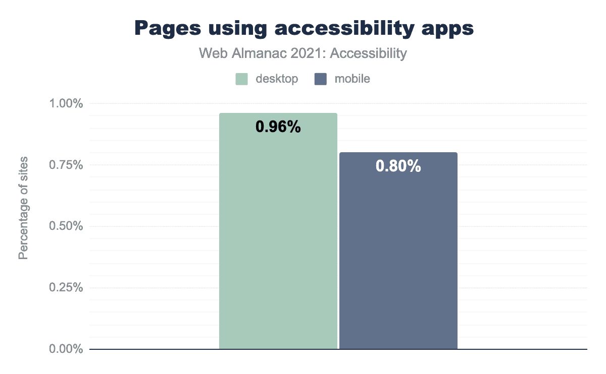 We found that 0.96% of desktop websites—or well over 60,000—use one of these accessibility overlays. It is worth noting that we have queried for a list of well-known products in this space. However, this list is not exhaustive, so this metric is likely higher in reality.