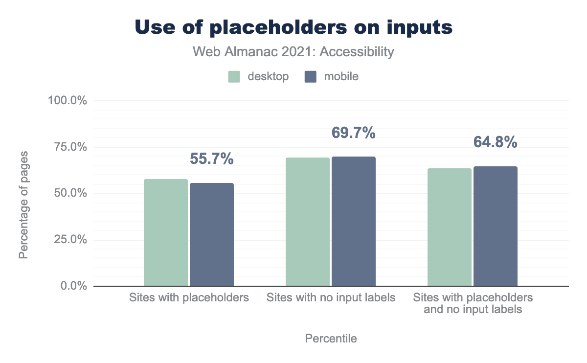 Removing an element’s semantics means that it is no longer that element in terms of its behavior or how it is understood by assistive technology, leaving only its visual appearance. For example, a list with a role="presentation" will no longer communicate any information to a screen reader about the list structure. We found that 22% of desktop pages and 21% of mobile pages have at least one element with role="presentation". There are very few use cases where this is particularly helpful for assistive technology users, so use this role sparingly and thoughtfully.