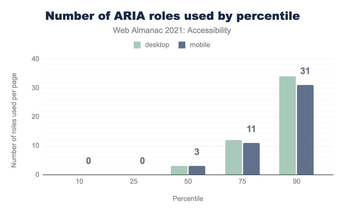 We found that 29% (up from 25% in 2020) of desktop sites and 29% of mobile sites (up from 25% in 2020) had home pages with at least one element with an explicitly assigned role="button". This suggests that close to a third of websites are using the button role on elements in order to change their semantics, with the exception of buttons that have been explicitly assigned the button role, which is redundant.