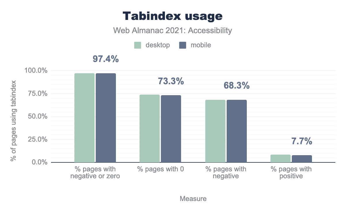 tabindex, a negative or zero tabindex is used on 96.9% of those pages for desktop and 97.4% of those pages for mobile, a tabindex of 0 is used on 68.2% and 68.3% respectively, a negative tabindex is used on 74.2% and 73.3%, and finally a positive tabindex is used on 8.7% and 7.7%.tabindex usage.