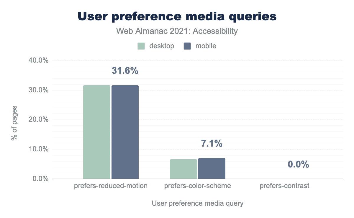 prefers-reduced-motion media query, 5.7% of desktop sites and 7.1% of mobile sites use prefers-color-scheme, and usage of prefers-contrast is so small on both it looks like 0.0%.