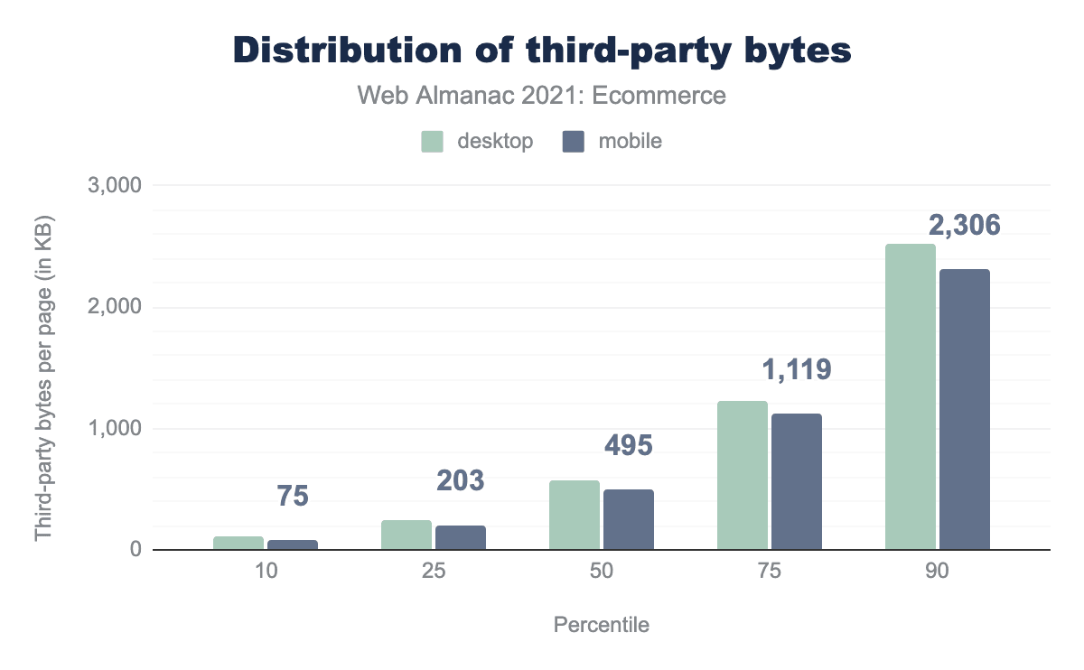 The weight of third-party content is also very similar to last year’s analysis. With sites in the 50th percentile requesting 495 KB of third-party content. The bottom 10% requested 75 KB while the top 10% requested 2306 KB.