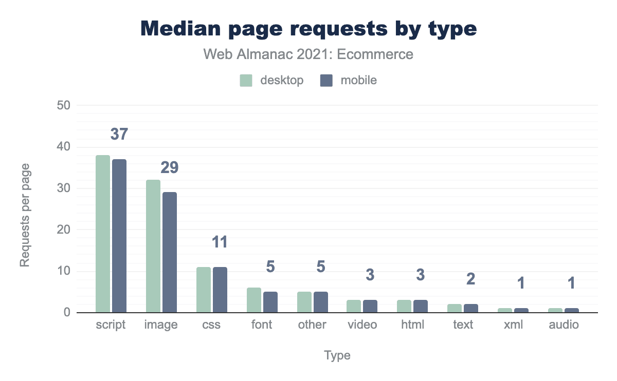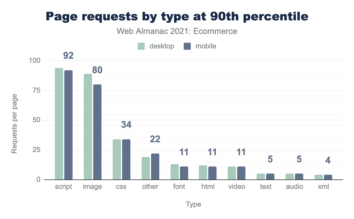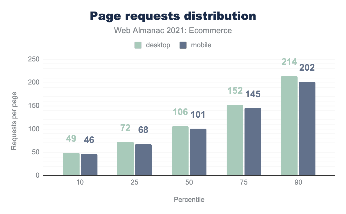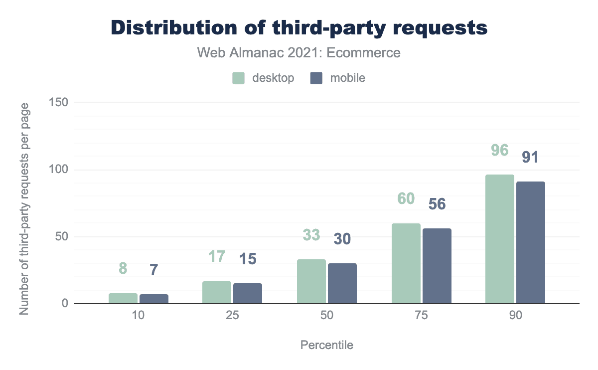 The median ecommerce site on mobile made 30 requests to third parties. While last year’s analysis saw an increase in third-party requests, this year the number is static with little change almost across the board. There is a slight change where the top 10% of pages have reduced the number of third-party requests from 98 to 91 on mobile and 103 to 96 on desktop.