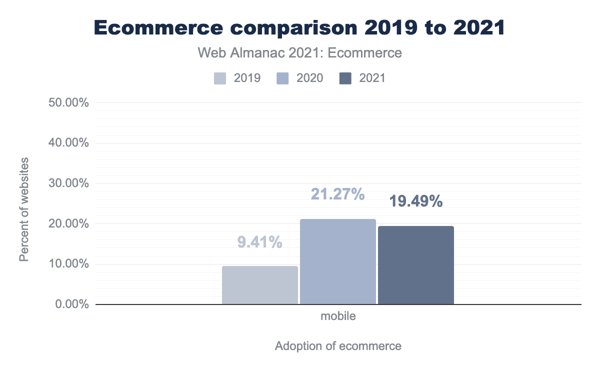 Comparing this with the 2019 results where 9.45% of mobile sites were ecommerce, we can see that while the change in the last year has been insignificant, over the last 2 years the increase is dramatic and sustained.