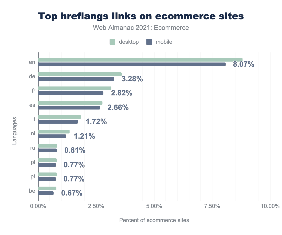 The results identified 8.81% of requests on desktop to specify an English hreflang and 8.07% on mobile ecommerce sites. The next most popular languages were German (3.28% on mobile), French (2.82%), and Spanish (2.66%).