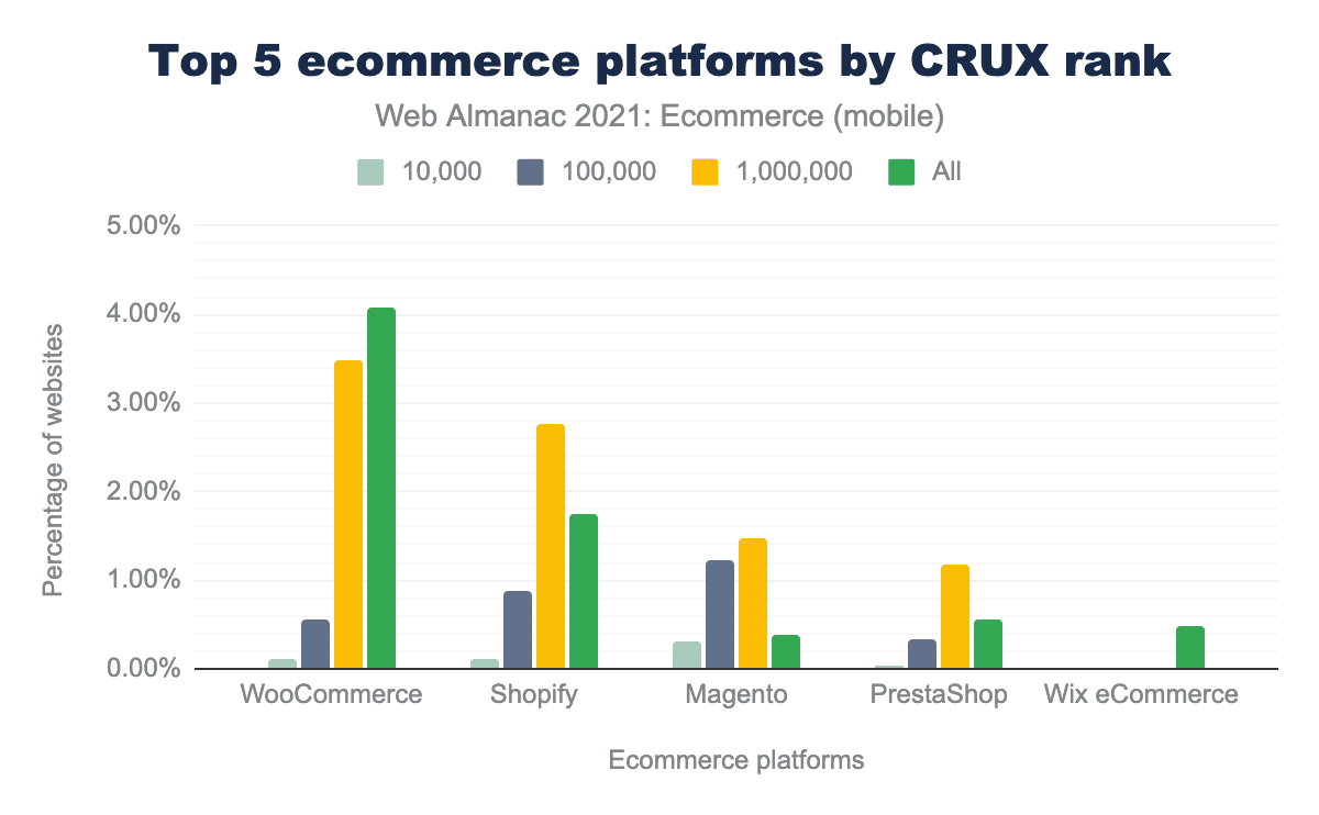 This year, the Chrome User Experience Report provided a popularity rank for each website. This allowed us to break down top ecommerce platforms by their popularity in different segments of the market. “All” refers to all 7.5 million sites that were profiled on mobile and 6.3 million sites for desktop.