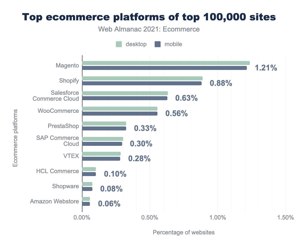 We also see Magento take the third spot over PrestaShop. Wix eCommerce and Squarespace ecommerce are no longer in the top 7 platforms. Instead, we see Shopware, BigCommerce, and Salesforce Commerce ahead of them.