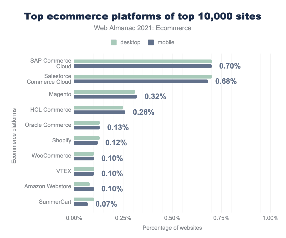 Salesforce Commerce Cloud and SAP Commerce lead and power a similar number of ecommerce sites (0.70 and 0.68% respectively on mobile).