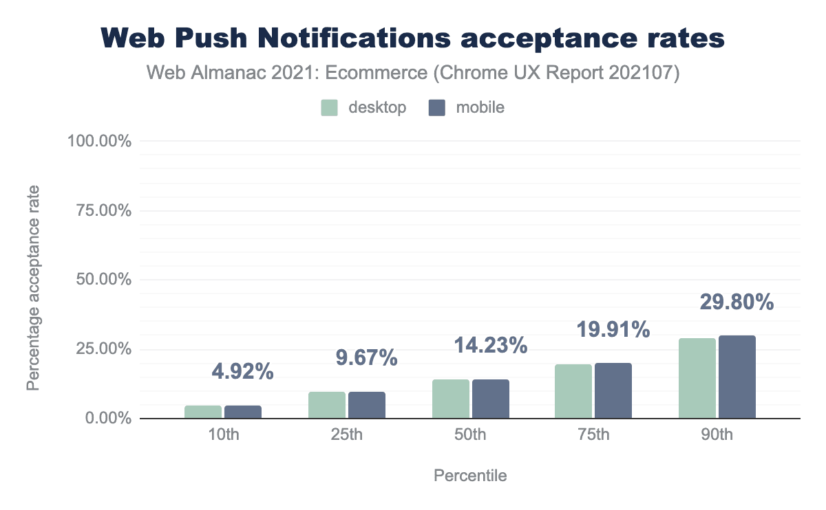 The Push notification acceptance rates are very similar to last year’s results. The median acceptance rate of push notification requests was 14.23% on mobile. Unfortunately, if there is any trend across year’s, it’s downwards. At the 90th percentile last year 36.9% of push requests were accepted compared to 29.80% this year on mobile.