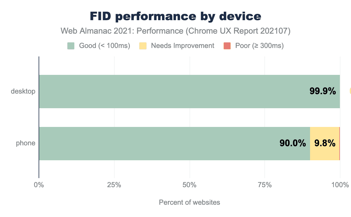 Encouragingly, 90% of mobile page loads in the CrUX dataset had a good FID score, up from 80% from 2020.