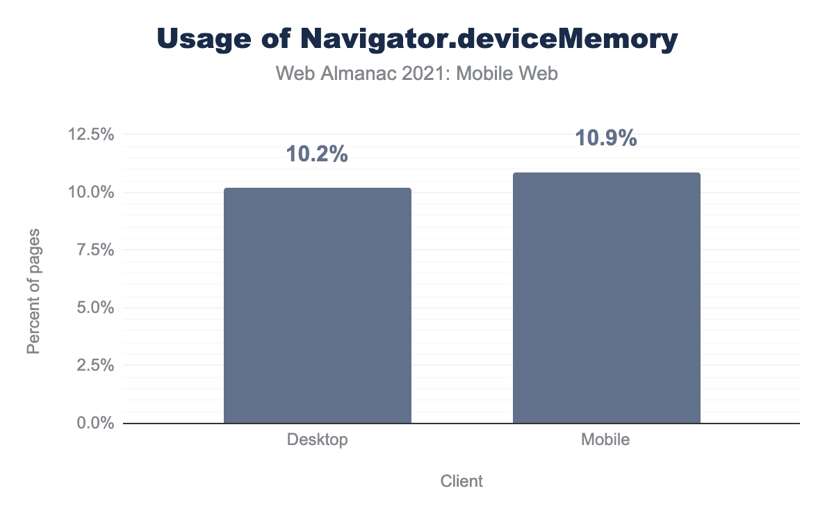 Navigator.deviceMemoryAPI on mobile and desktop. 10.2% of desktop sites used the Device Memory API compared to 10.9% of mobile page loads.Navigator.deviceMemory.
