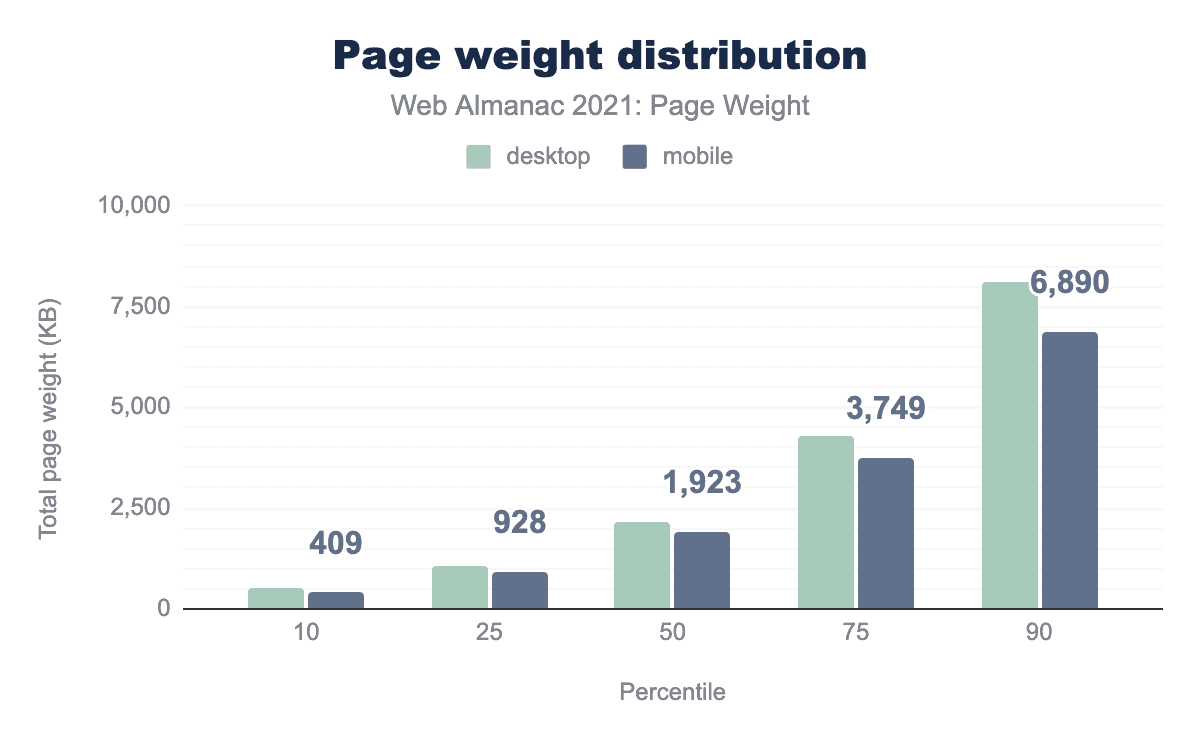 We are closing in on 6.9 MB of page weight on mobile and 8.1 MB on desktop at the 90th percentile.