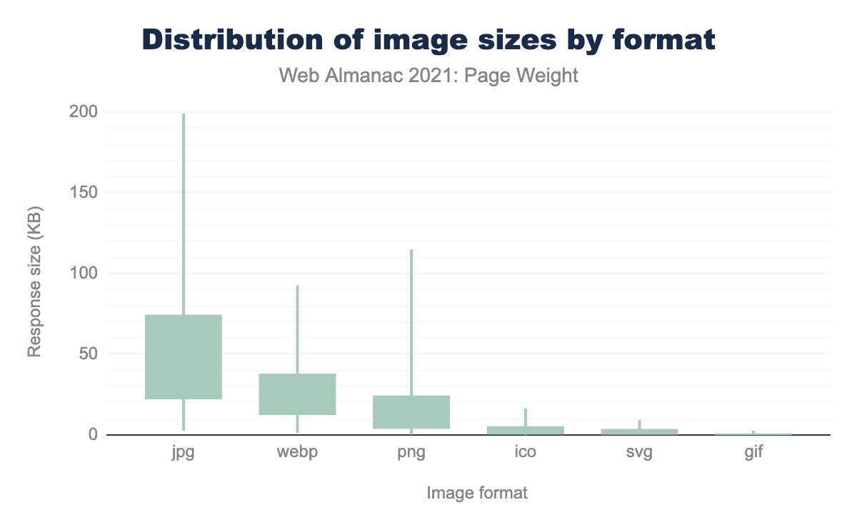 We know images are responsible for a large percentage of web page weight. The above graphic shows the top sources of image weight and the weight distribution. Top 3: JPG, WebP and PNG. Compared to last year, we see an increase in WebP usage now it is finally supported in all major browsers. PNG remains popular for use cases such as icons and logos.
