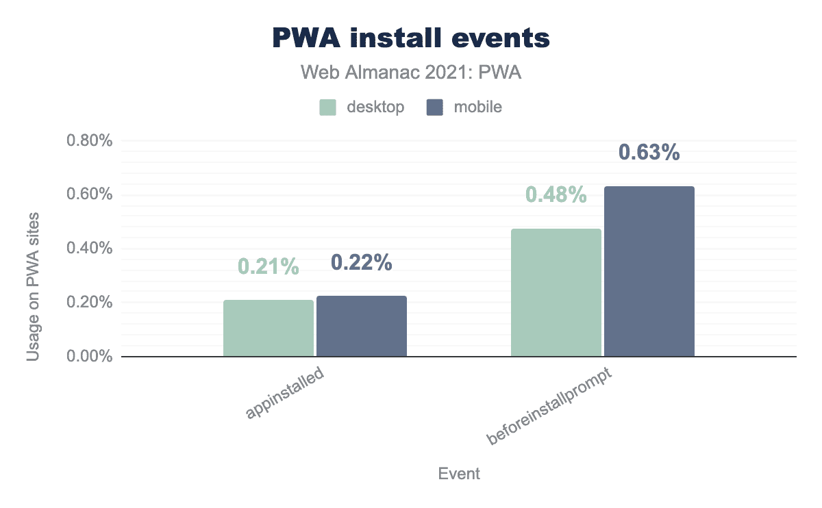 Our analysis showed that beforeinstallprompt is being used in 0.48% of desktop and 0.63% of mobile sites that have a service worker and a manifest.