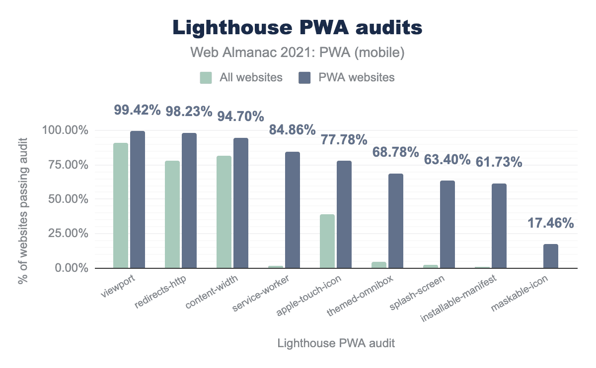 PWA Builder reviewed 200k URLs over a 3-month timeslot and discovered that: