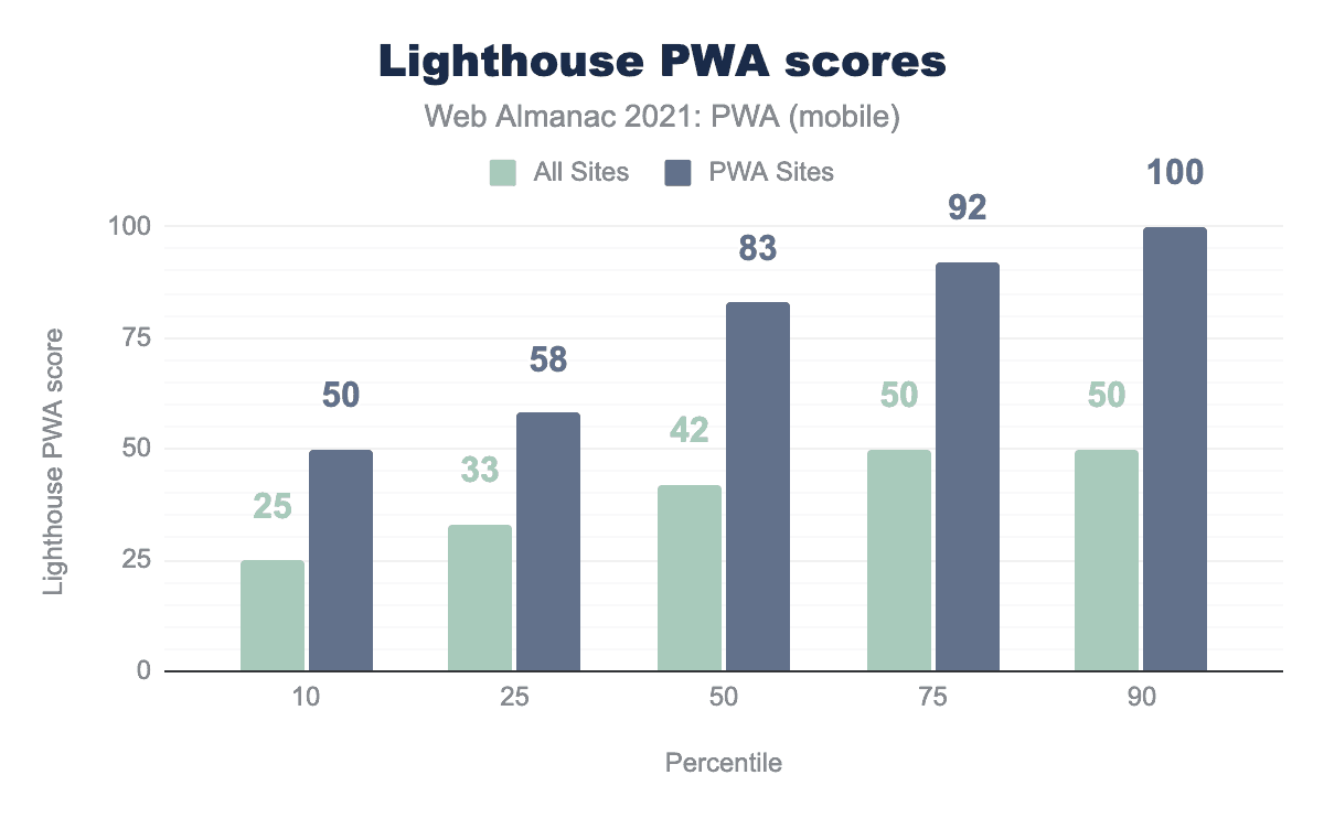 • The median score for “PWA sites” is 83, versus 42 for “All sites”.