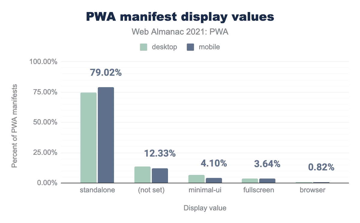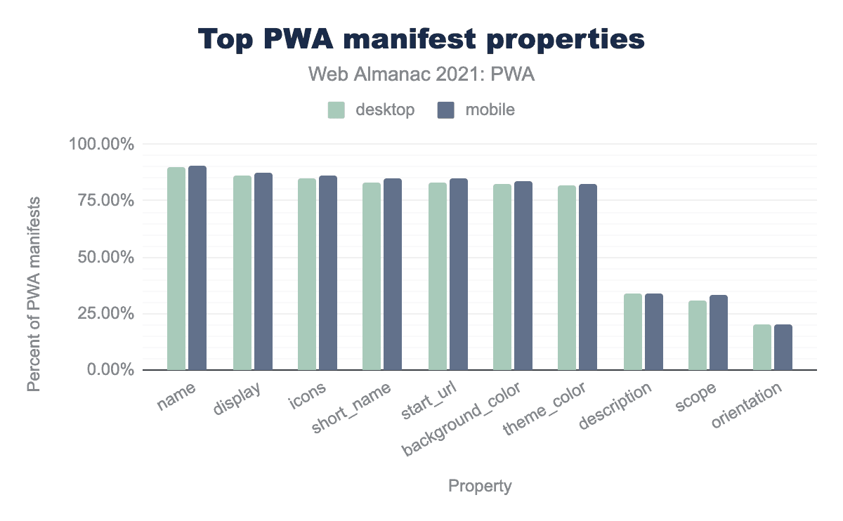 • display: This property is declared in 86.49% of desktop and 87.67% of mobile sites. It’s used to indicate the display mode of the website. If it’s not indicated, the default value is browser, which is the conventional browser tab, so most PWAs declare it to indicate that it should be opened in standalone mode instead. The ability to open in standalone mode is one of the things that help create an “app-like” experience.