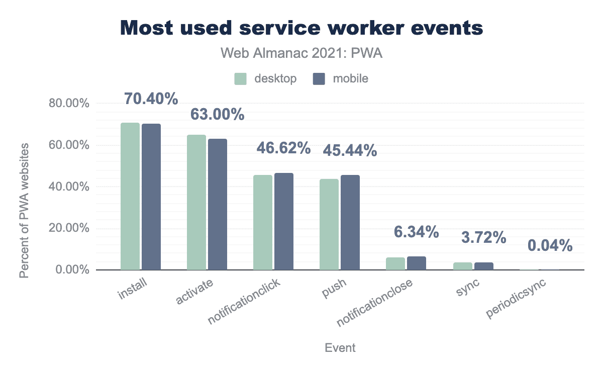 Both event listeners have a high adoption: 70.40% of mobile and 70.73% of desktop PWAs implement an install event listener and 63.00% of mobile and 64.85% of desktop listen to activate. This is expected as the tasks that can be performed inside these events are critical for performance and reliability (for example, precaching). Reasons for not listening to lifecycle events include: using service workers only for notifications (without any caching strategy) or applying caching techniques only to requests made by the site while it is running, a technique called runtime caching which is frequently (but not exclusively) used in combination with precaching techniques.