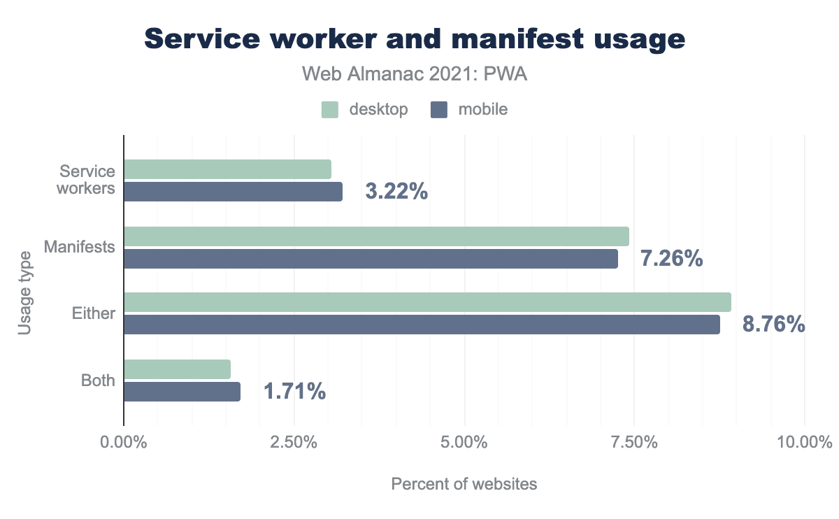 Manifests are used on more than twice as many pages as service workers. One of the reasons being that some platforms (like CMSs) automatically generate manifest files for sites, even those without service workers.