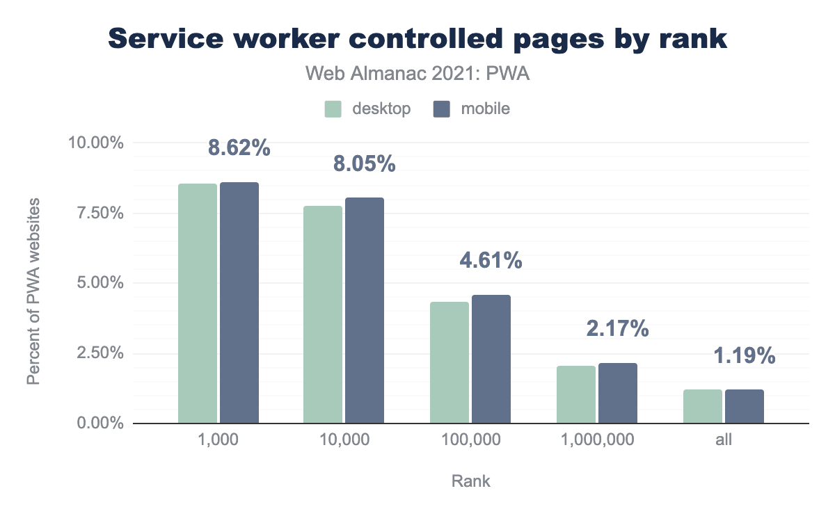 When measuring the top 1,000 sites, 8.62% of them use service workers. As we broaden the number of sites under analysis, the overall percentage starts to decrease. This indicates that the most popular sites are more prone to use features like service workers and advanced capabilities.
