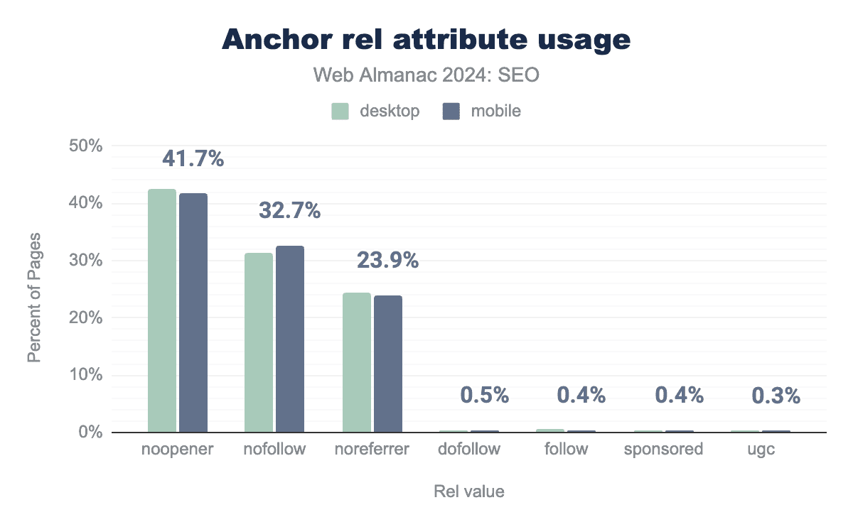 Some more specific attributes were introduced in 2019, including sponsored, which denotes a link to sponsored content and ugc, which denotes links to user-generated content added by users (rather than publishers). Adoption of these attributes remains low. In 2024, it was just 0.4% for sponsored and 0.3% for ugc. Both were less popular than or equal to dofollow and follow, which actually aren’t even real attributes and are ignored by search engines.