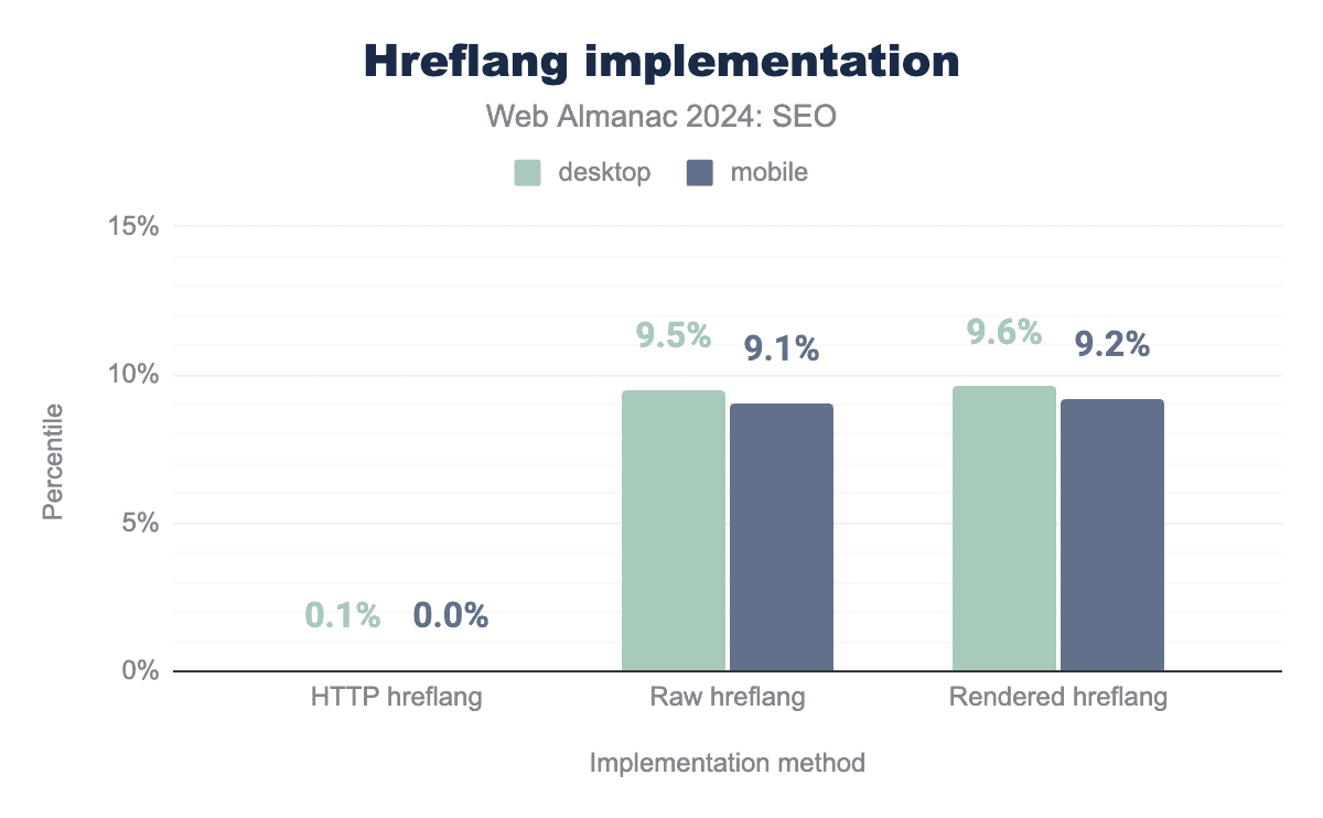 hreflang implementation on desktop and mobile sites. It shows HTTP hreflang: 0.1% (desktop) and 0.1% (mobile); Raw hreflang: 9.5% (desktop) and 9.1% (mobile); Rendered hreflang: 9.6% (desktop) and 9.2% (mobile)hreflang implementation.