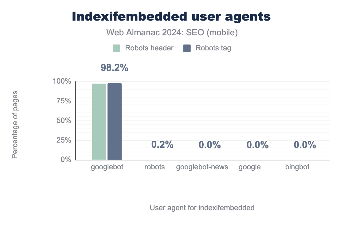 Googlebot user agent.The generic robots user agent was stated 0.2%. The other user agents (including Googlebot-News and Bingbot) show 0% usage.As we saw in 2022, indexifembedded directives continued to be almost exclusively used for Googlebot. While robots header use decreased slightly to 97.2% in 2024 from 98.3% in 2022, adoption of the robots tag increased significantly to 98.2% in 2024 from 66.3% in 2022.