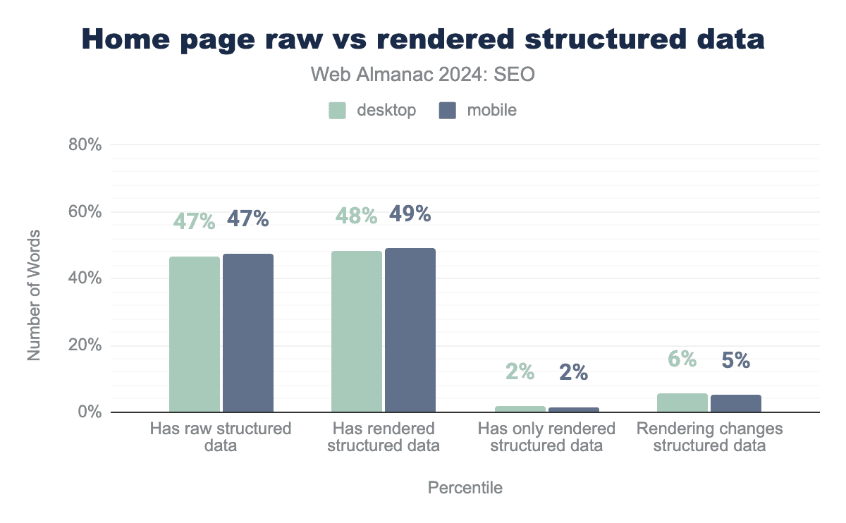 Overall usage of structured data grew in 2024 to 49% of mobile home pages and 48% of desktop home pages. This was a slight increase from 2022 when 47% of crawled mobile home pages and 46% of crawled desktop home pages had structured data.