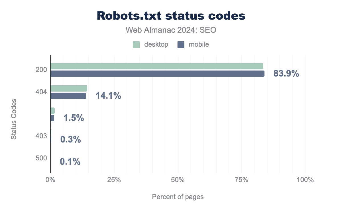 robots.txt file. A total of 83.9% of mobile sites returned a 200 status code, while 14.1% returned a 404 status code. No response was received for 1.5% of mobile requests to the file. Just 0.3% and 0.1% of mobile requests received a forbidden (403) or server error response. Response distribution on desktop behaved similarly with 83.5% returning a 200 status code, while 14.3% returned a 404 response code. No response was received for 1.7% of mobile requests to the file. Just 0.3%, and 0.1% of mobile requests received a forbidden (403) or server error response.robots.txt status codes.