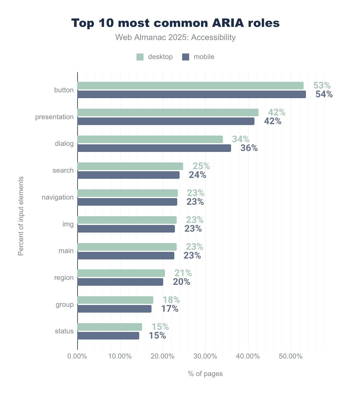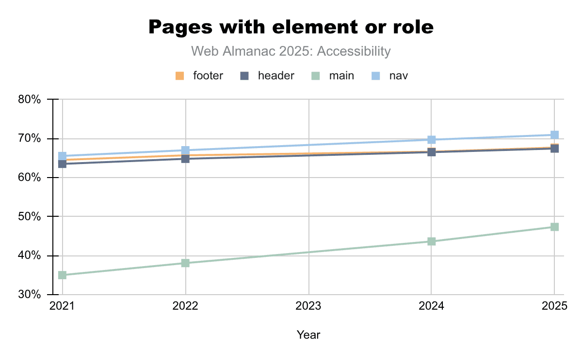 role attributes (footer, header, main, nav) across five years. Usage has grown steadily for all roles: nav leads at 66% in 2021 rising to 71% in 2025, followed by footer (65% to 68%), header (64% to 67%), and main (35% to 47%).In 2025, the adoption of ARIA landmarks has increased slightly, led by the growing use of the native <main> element, now at 47%, up 3% from 2024. This progress reflects better compliance with semantic HTML and more robust page structure for users relying on assistive tools.