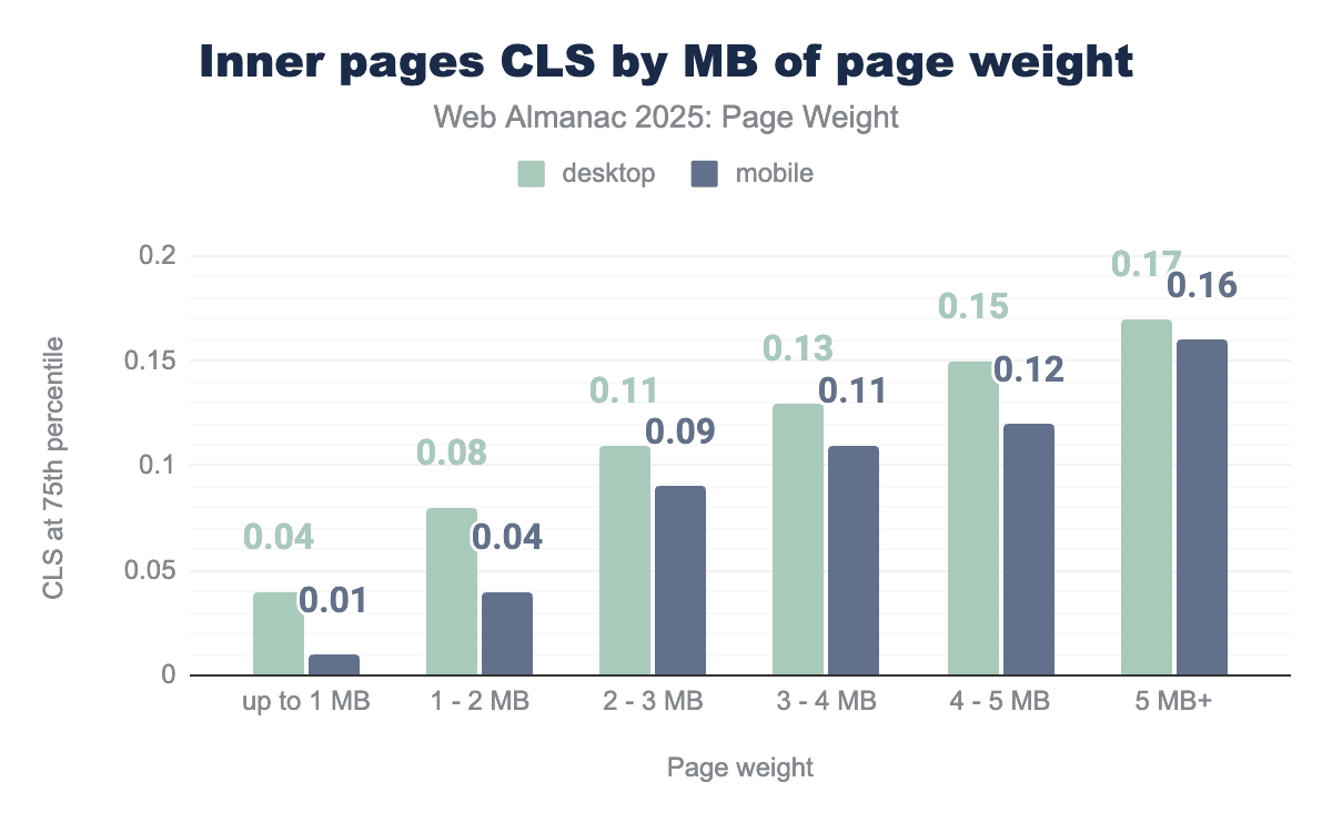 The impact of page weight on inner page CLS shows a consistent march across the ranges. Desktop pages under 2 MB and mobile pages under 3 MB were able to achieve a score of less than 0.10. Pages over 3 MB consistently scored over the desired threshold.