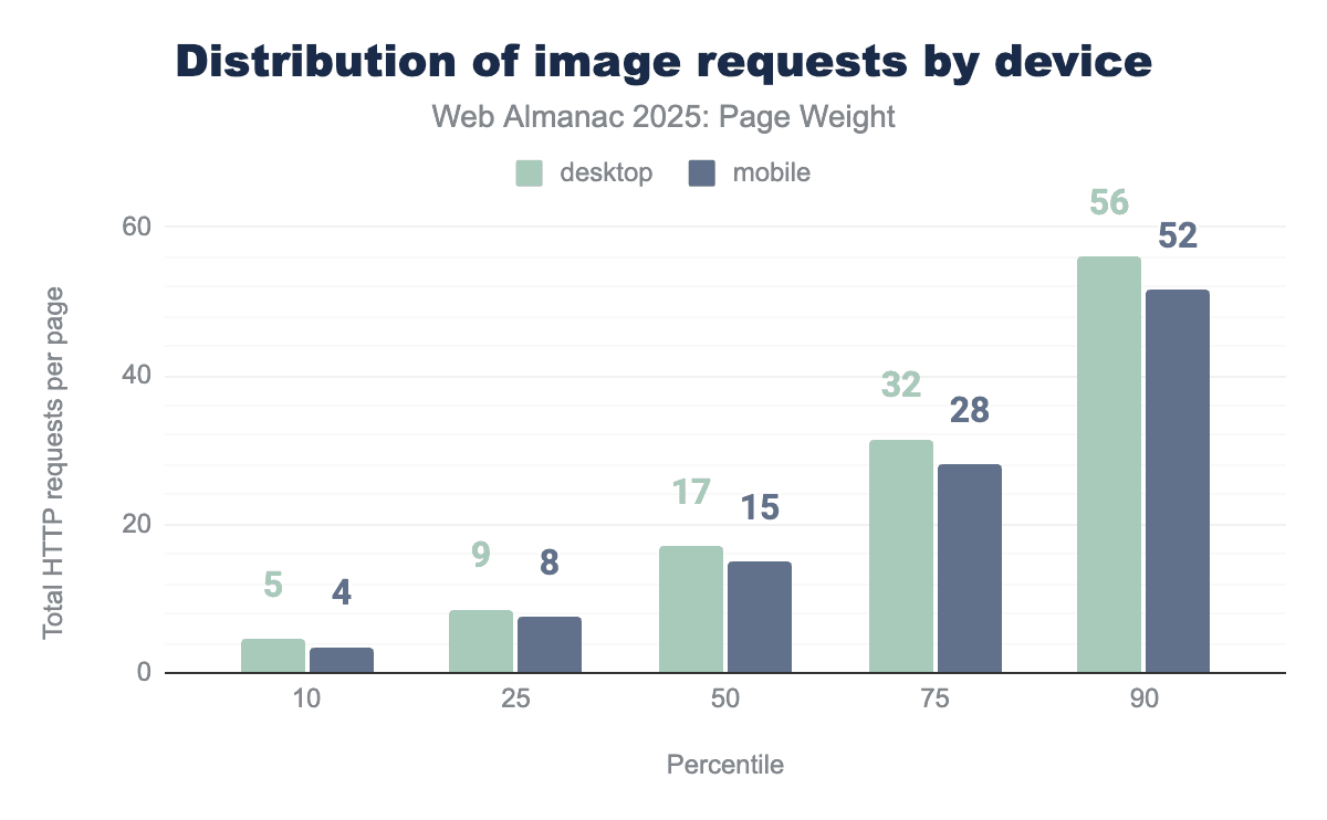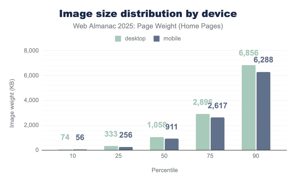 A web page rarely uses a single image. When aggregated together, the median desktop page used 1,059 KB of images. Mobile pages used 911 KB. Desktop pages consistently loaded more total image bytes.