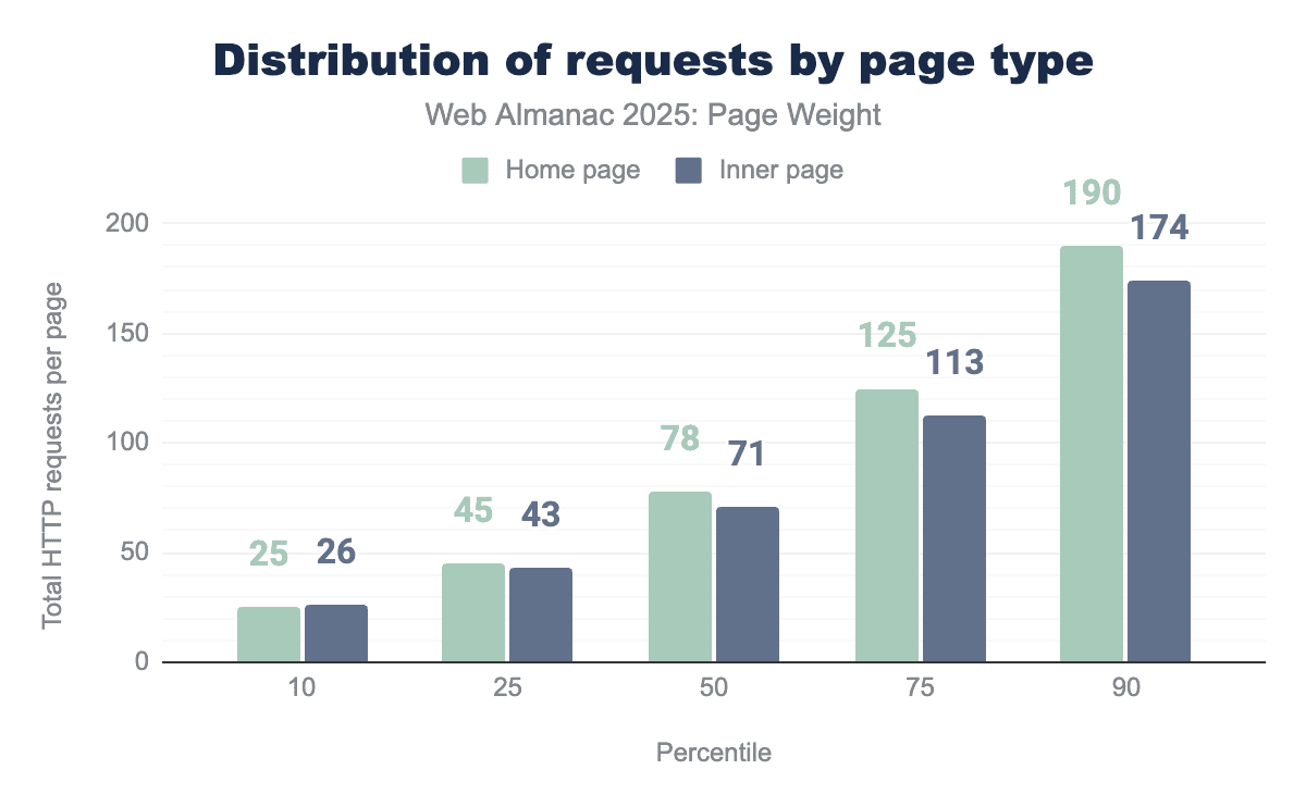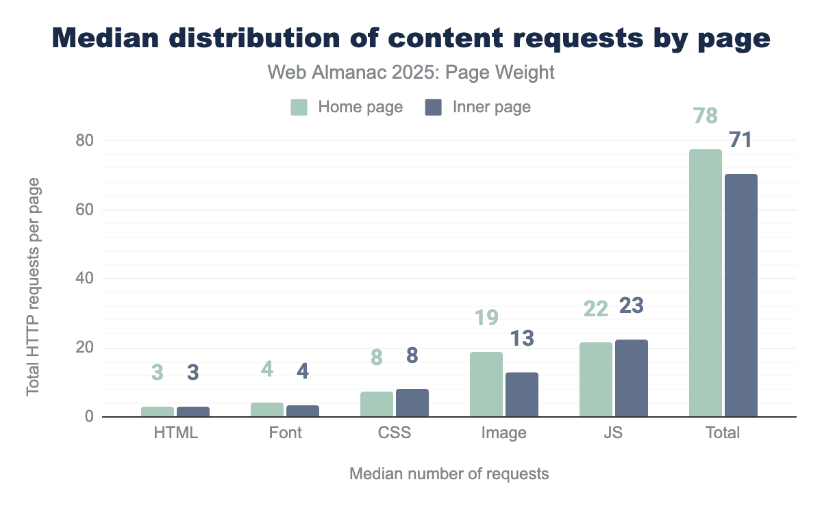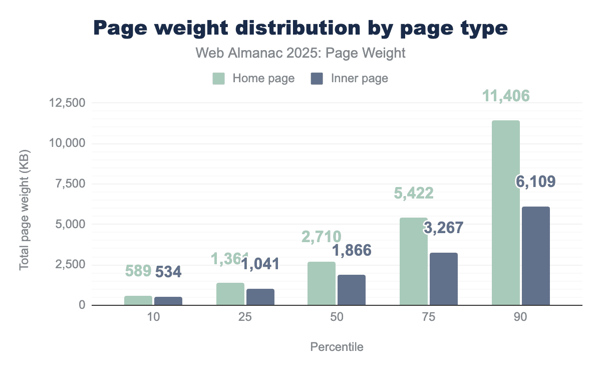 As observed above, inner pages tend to be lighter than home pages. In 2025, the median home page weighted 2.9 MB for desktop and 2.6 MB for mobile. Inner pages were lighter in comparison, with median sizes of 1.8 MB for mobile, and 2 MB for desktop.