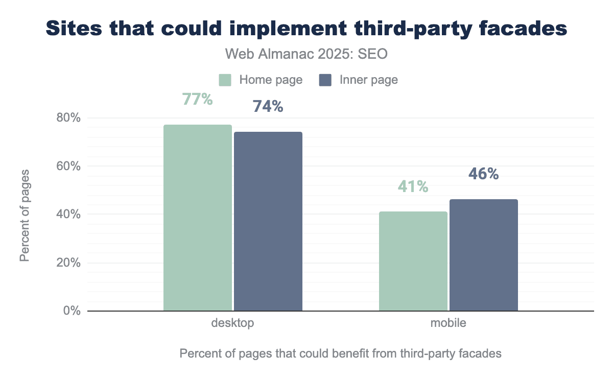 41% of home pages on mobile loads and 77% of home pages loaded with the desktop client were detected as having an opportunity to implement lazy loading with facades. This represents a regression from 2024 for desktop, where 70% were detected, but mobile loads represent an improvement from 45%.